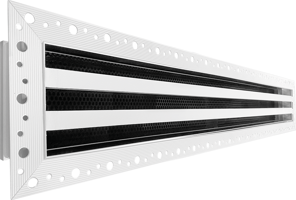 Щелевые решетки A-Line-H изготавливаются из экструдированного алюминиевого профиля. По умолчанию корпус диффузоров окрашивается в стандартный белый цвет RAL 9016, а внутренняя перфорированная кассета и ламели в чёрный цвет RAL9005.