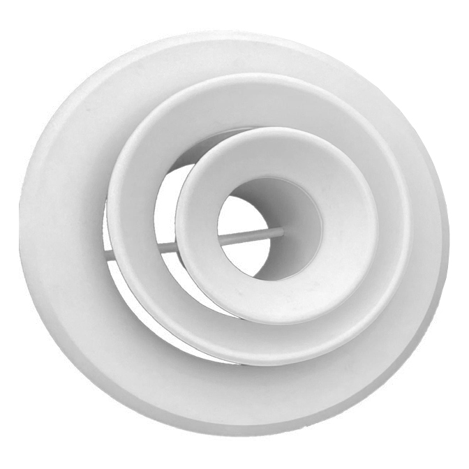 Диффузор изготавливается из оцинкованного листового металлопроката толщиной 0,9 мм и окрашивается порошковыми полиэфирными эмалями в любой цвет по международной шкале RAL. Такое сочетание материала используемого при производстве и финишной обработки гарантированно обеспечивает защиту от коррозии, а также от выцветания/потускнения цвета под воздействием ультрафиолета. По умолчанию диффузоры окрашиваются в белый цвет RAL 9016М (матовый).