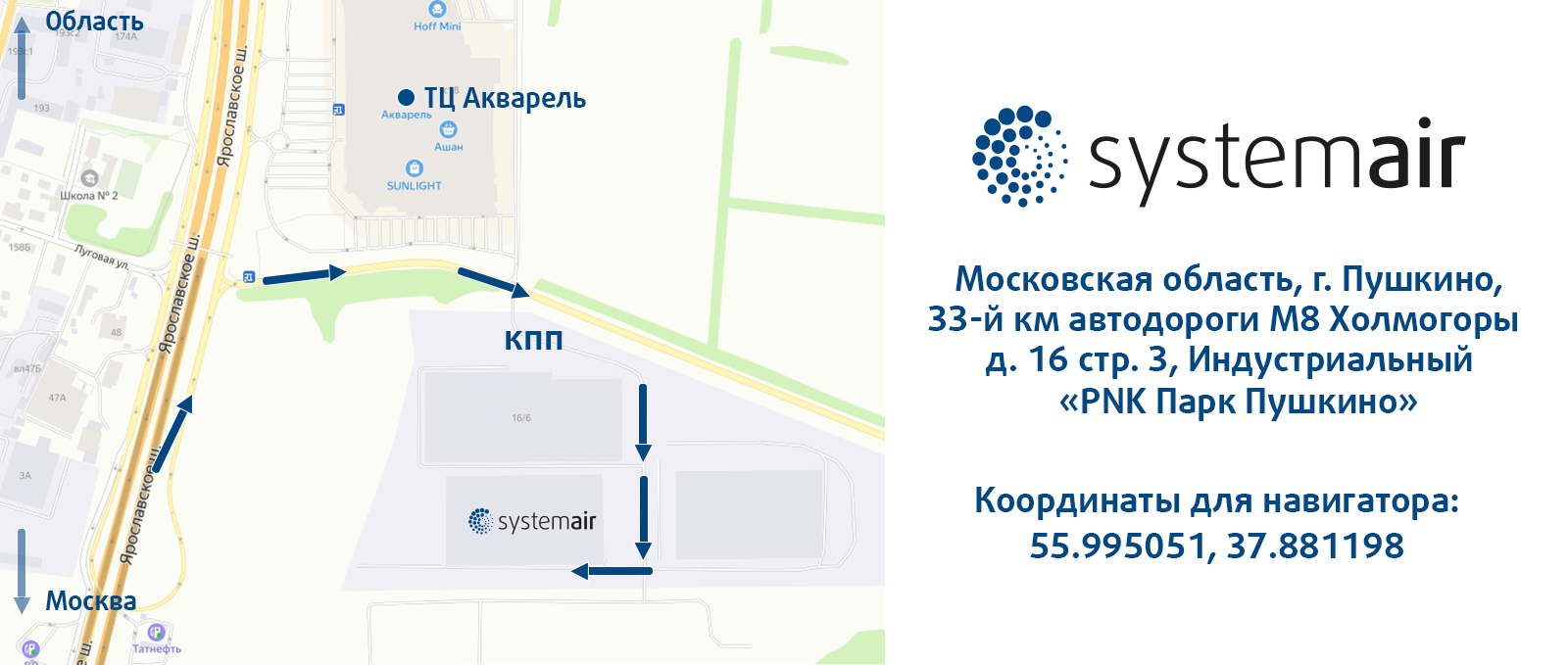 Новый завод, центральный склад в РФ и Сервисный центр Systemair расположены по адресу: Московская область, г. Пушкино, 33-й км автодороги М8 Холмогоры (16 км от МКАД по Ярославскому шоссе), д. 16, стр. 3.